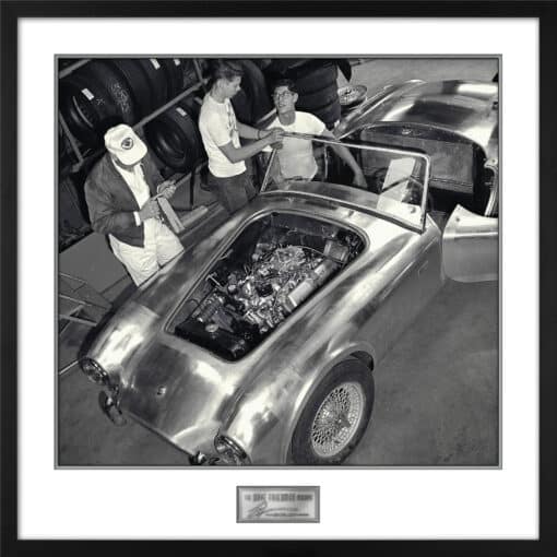 The first Cobra being built at Dean Moon’s Shop. February 1962 20″ x 20″ print on silver metallic paper in a black frame with pewter plaque.
