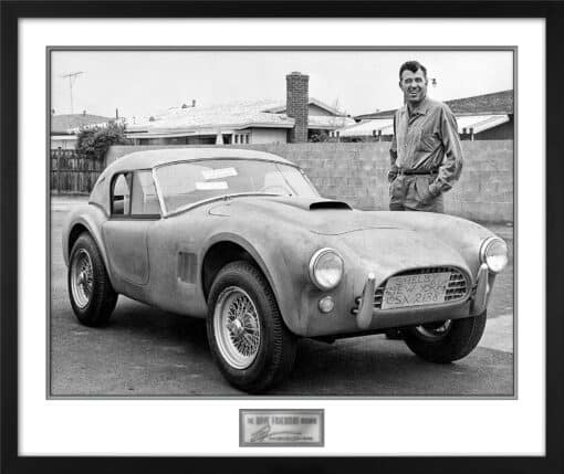 Carroll Shelby poses with a Cobra. Roller just arrived. Note the Venice shop was in a residential area. Venice California February 1963 24″ x 20″ print on silver metallic paper in a black frame with pewter plaque.